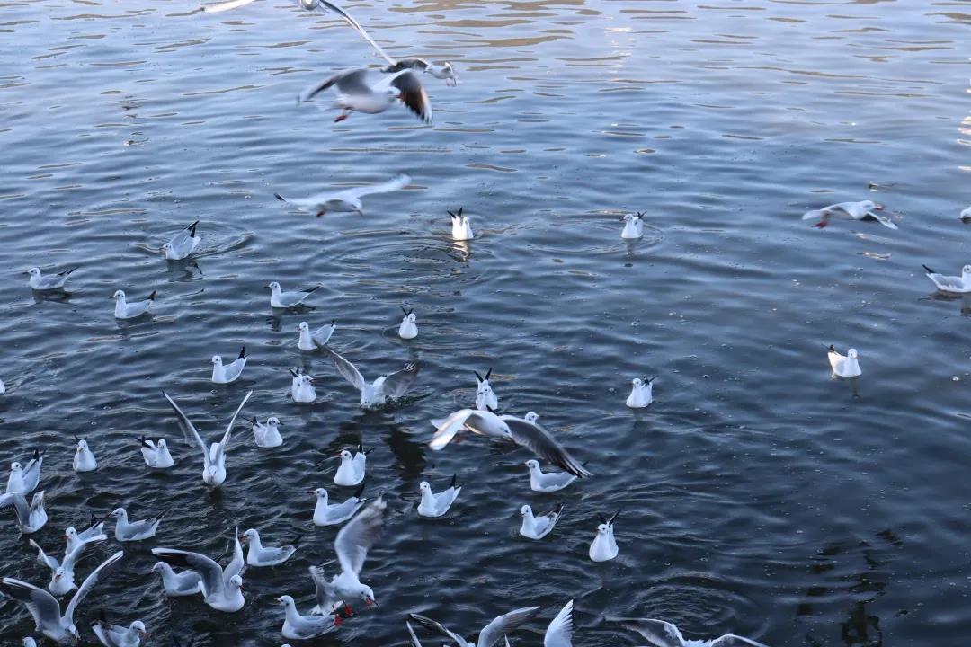 活动中,志愿者们秉承着“保护红嘴鸥、爱护大自然”的宗旨,积极投身公益护鸥活动之中。志愿者们不仅为红嘴鸥拍照,记录下它们美丽的身姿和整齐的队形,还和红嘴鸥合照,记录这美好的人与鸥的和谐时光。志愿者们还用自己带来的鸥粮喂食红嘴鸥。在护鸥的过程中,志愿者们与自然亲近,近距离接触红嘴鸥。