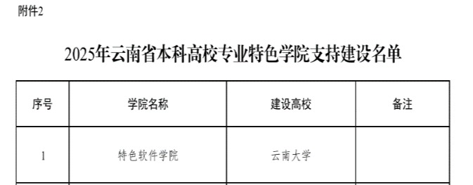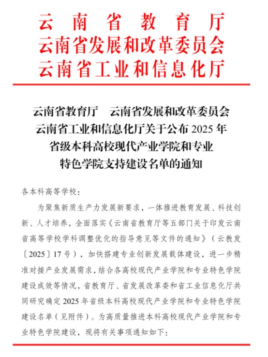近日,云南省教育厅、云南省发展和改革委员会、云南省工业和信息化厅联合发布《2025年省级本科高校现代产业学院和专业特色学院支持建设名单》。在学校指导支持下,我院申报的“特色软件学院”成功入选省级专业特色学院支持建设名单。这一突破,不仅标志着学院办学实力的全面提升,更为学院服务地方经济发展和国家战略提供了全新平台。