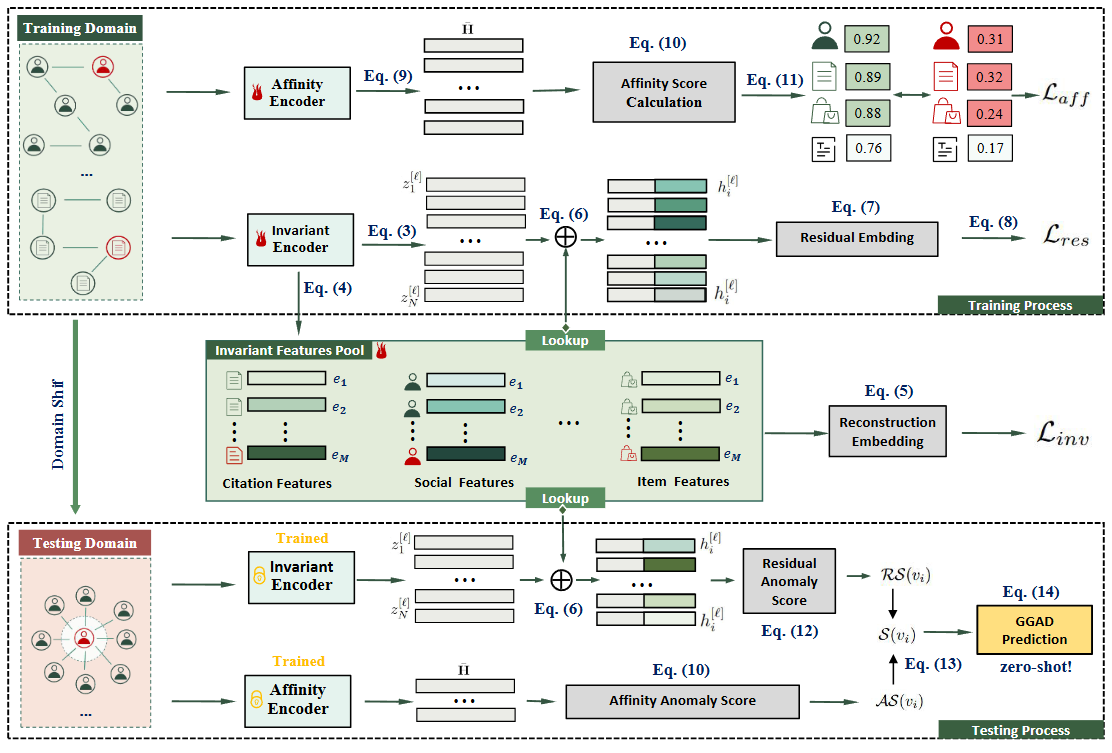 IA-GGAD(Invariant and Affinity Combined Generalist Graph Anomaly Detection) 首次从理论上和实验上提出了图基础模型面临的节点漂移(FSS) 和结构漂移(GSS)问题。针对性的设计了图不变和图亲合力学习模块。有效的缓解了漂移问题。传统图异常检测模型通常需要针对每个数据集单独训练,难以适应多源异构场景。IA-GGAD 创新性地提出不变特征学习(Invariant Learning)与结构无关亲和学习(Affinity Learning) 相结合的统一框架,首次从理论上形式化并量化了特征空间偏移 (Feature Space Shift, FSS) 与图结构偏移 (Graph Structure Shift, GSS) 两大挑战,并通过融合语义与结构证据,生成最终的领域无关异常评分及预测结果。实验结果表明,提出的模型相较目前最先进的模型有平均 10 个百分点以上的精度提升,为图基础模型在异常检测方面提供了全新的理论依据和实践路径!