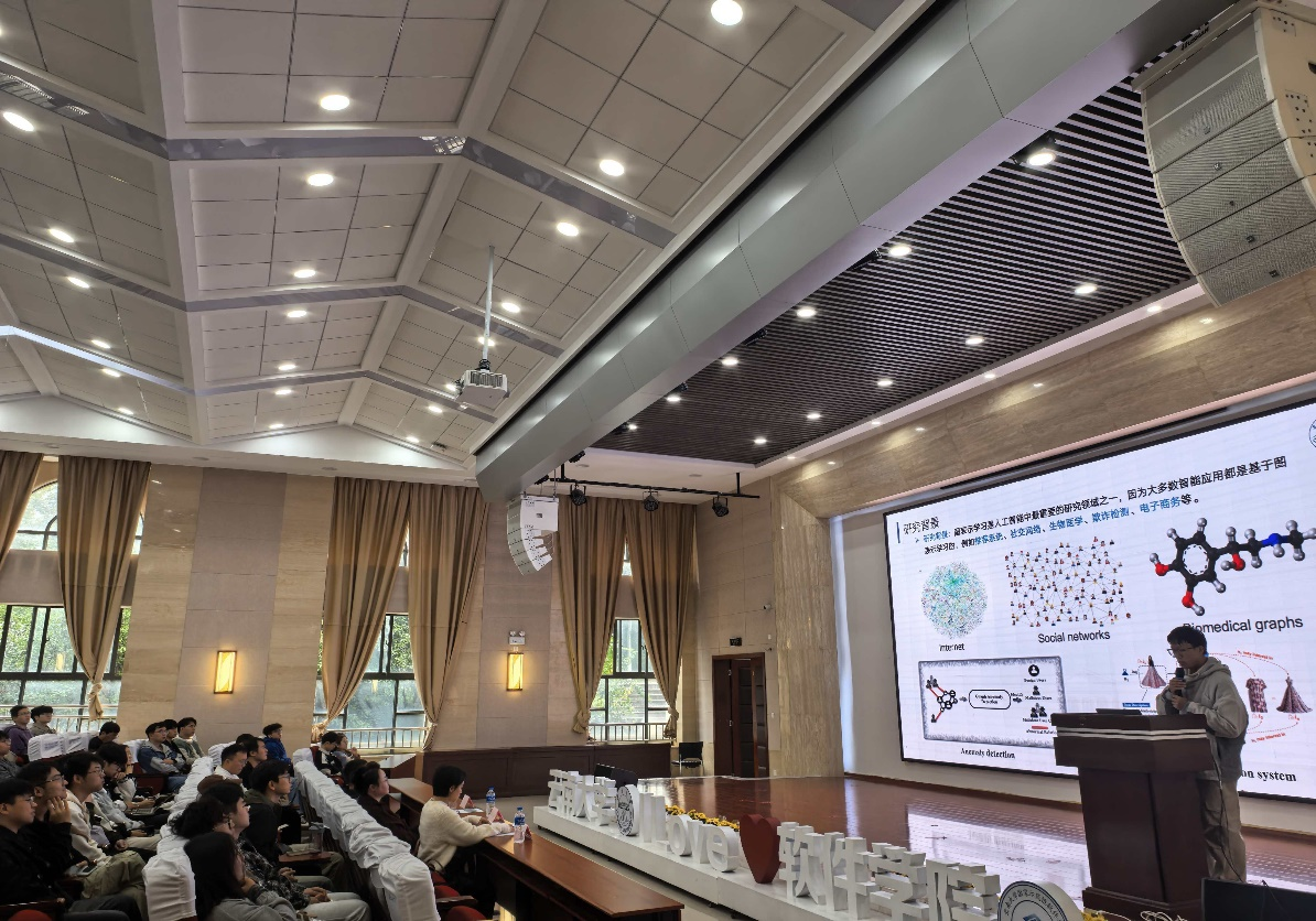 在“科研论文”成果分享专场,三位同学带来了在图表征学习、图异常检测、遥感图像分辨率恢复等领域的成果。学生分享人以严谨的科研逻辑、精准的言语表达,生动阐述了相关科研成果的创新点、核心贡献与研究历程;同时也分享了发表高水平论文的经验方法,展现了“以科技创新驱动发展,以技术进步服务社会”的青年担当。