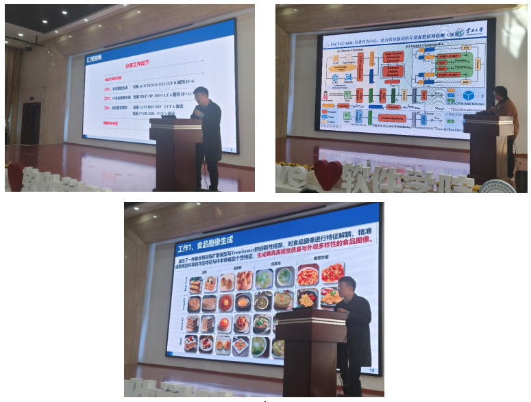 经过学生前期报名与选拔,三位在科研工作中表现优异的硕士研究生依次登台汇报研究成果、分享科研经验。三位学生代表聚焦食品计算、虚假新闻检测、小样本学习方法等前沿研究领域,深入浅出地讲解了各自在计算机科学、人工智能以及相关交叉领域取得的创新性成果于核心贡献;同时也分享了在科研中的心得与经验。这种“以成果为驱动”的分享模式,切实提升了学生的学术表达力与创新实践能力,展现了“智能交叉”系列活动的核心主旨。